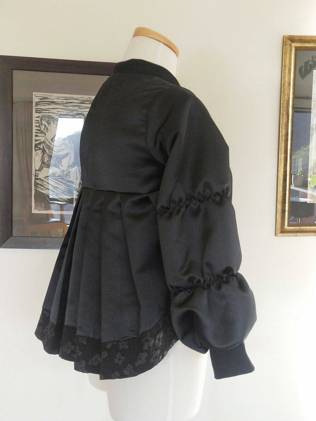 Made in a medium weight satin with featured back and sleeves and a hem border in contrast fabric.